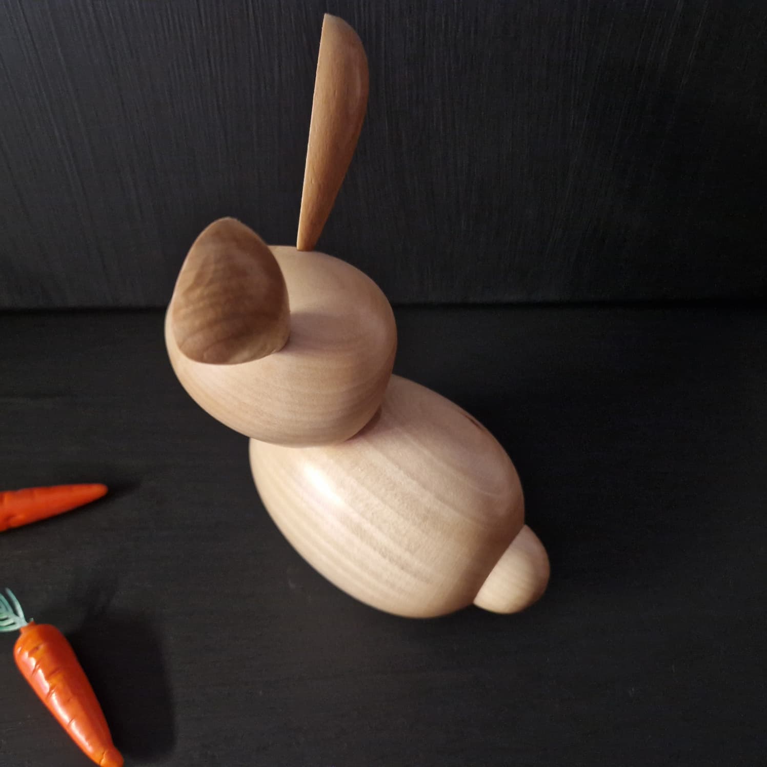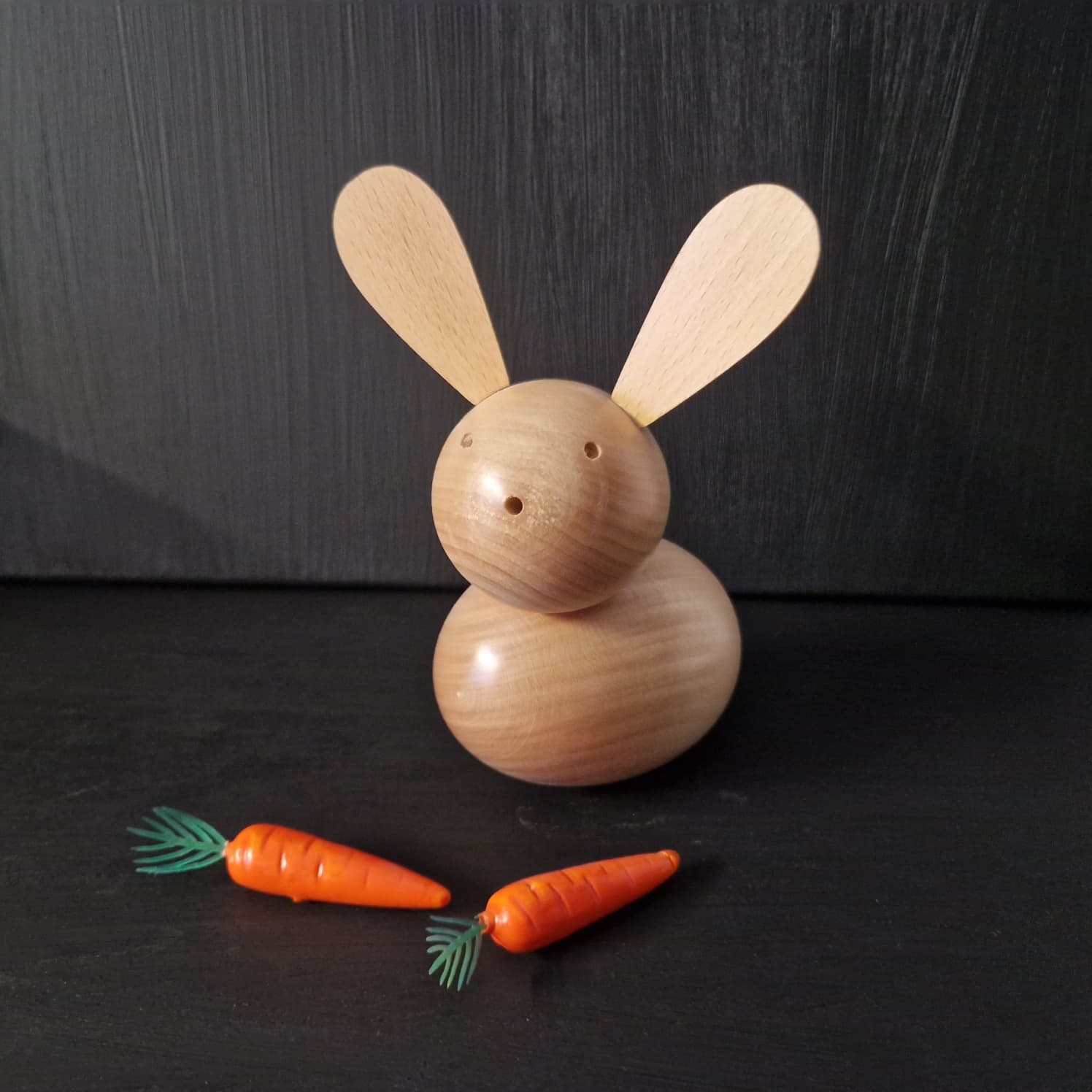 Ce petit lapin tout en rondeur est façonné à la main avec amour. Son corps en tilleul, bois doux et léger, lui donne un air tendre et rassurant, tandis que ses oreilles en hêtre bien dressées prouvent qu’il est toujours à l’écoute.. surtout s’il est question de carottes.