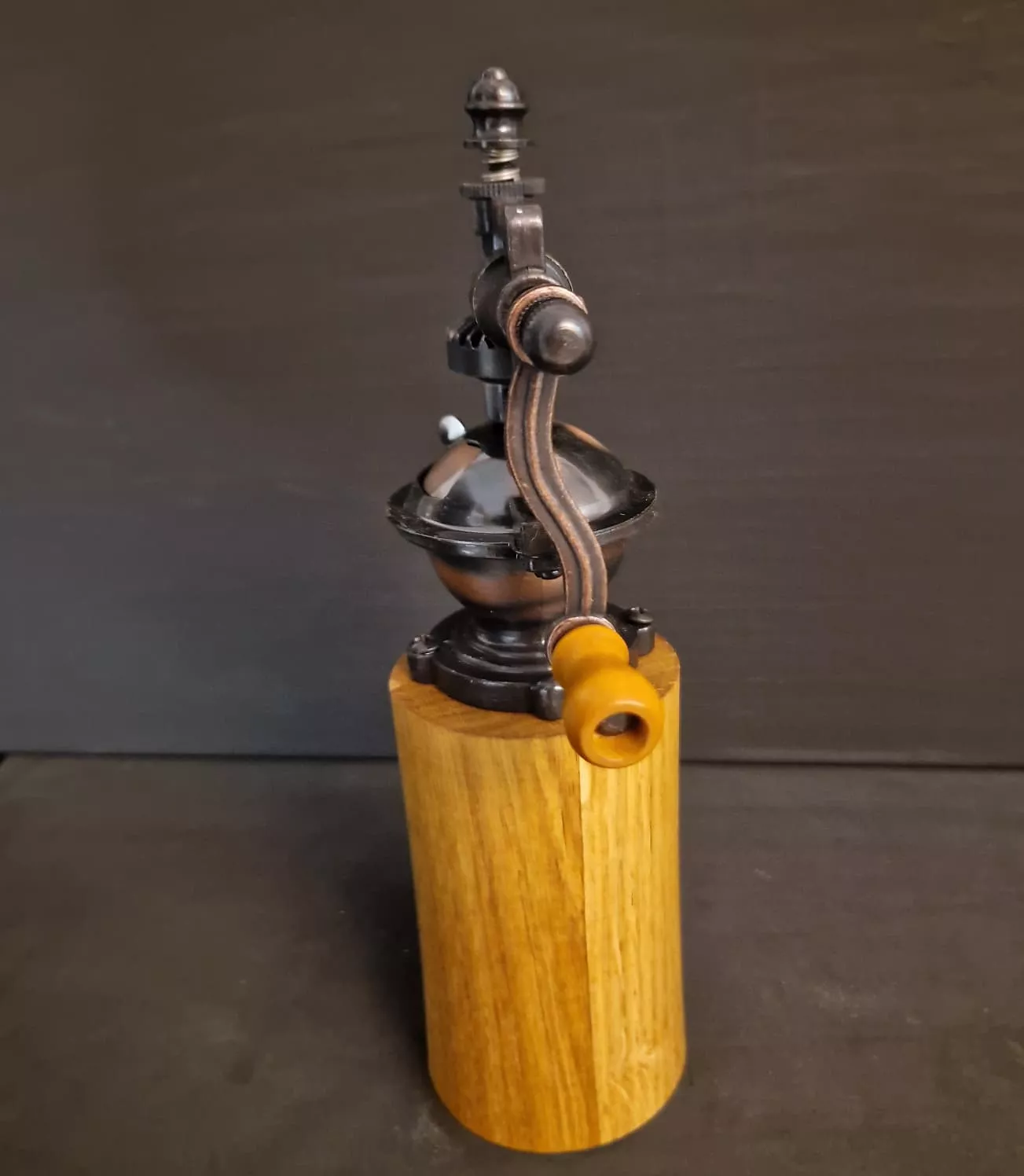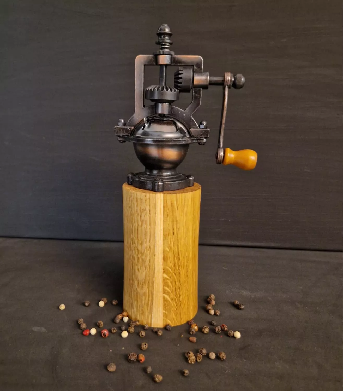 Le moulin est tourné entièrement à la main, dans un chêne sélectionné, souligné d’un liseré délicat d’érable et de sapin.