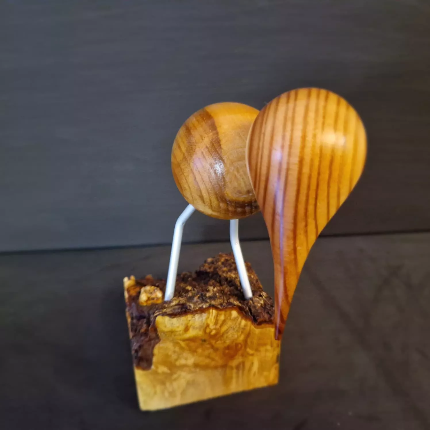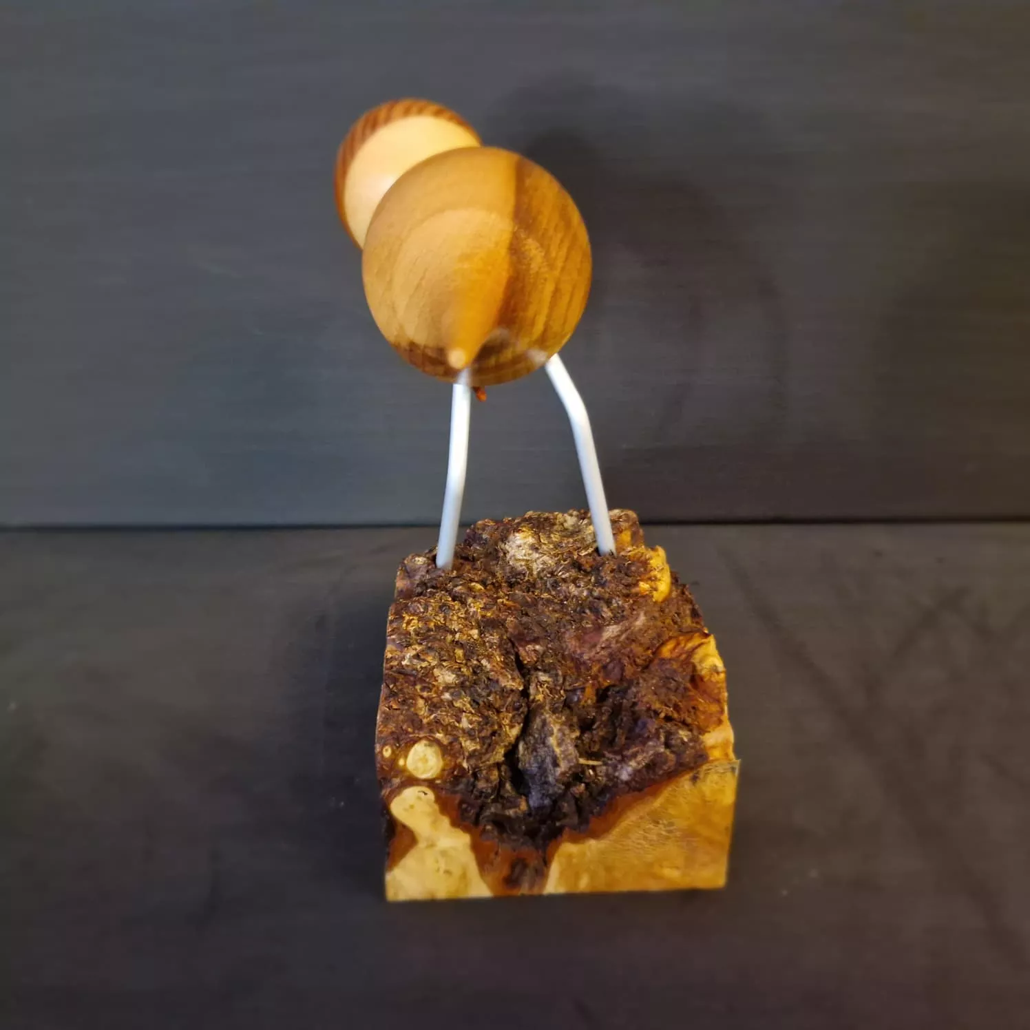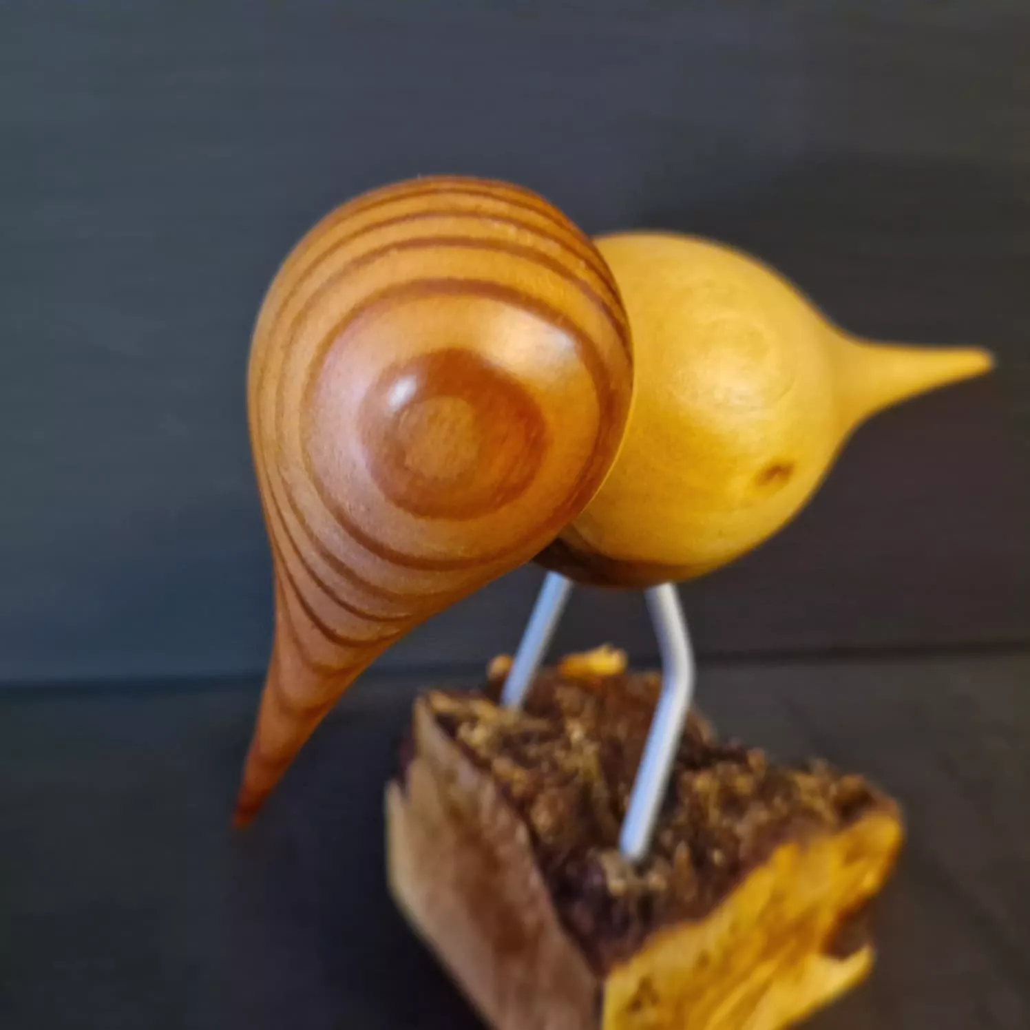 Petit oiseau au grand caractère, tourné à la main, perché fièrement sur son socle en érable. Ses pattes en aluminium lui donnent un look élancé, tandis que son corps en tilleul et sa tête en tilleul/mélèze révèlent de jolies nuances naturelles.