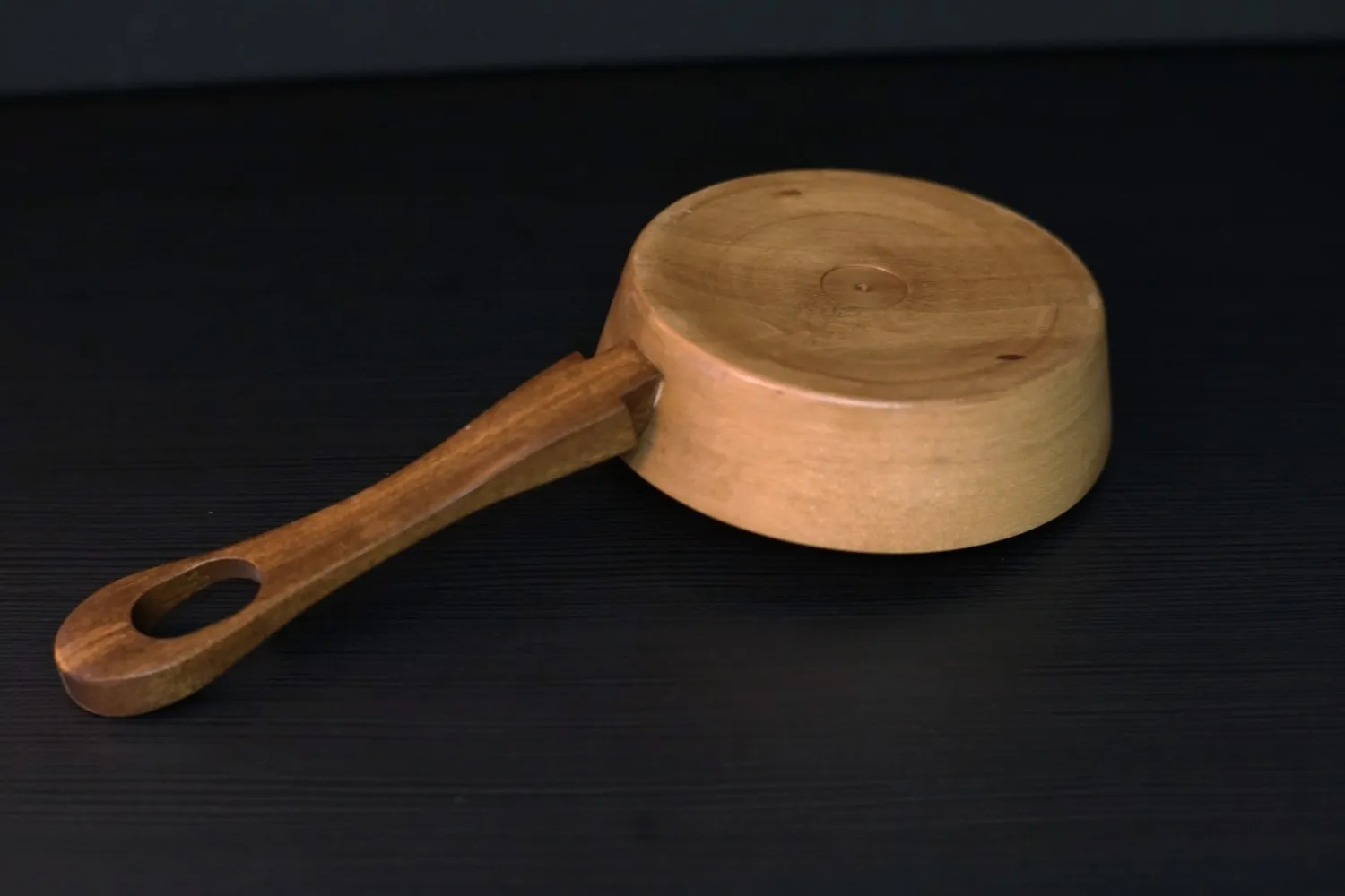 Une création unique qui mêle humour et artisanat, cette poêle est tournée dans du bois de poirier, son manche est travaillé en acajou, œuf au plat sculpté dans le bois et peint à la main (ne se mange pas… même si on a envie)
