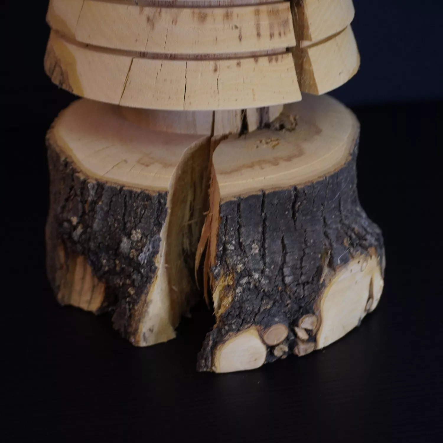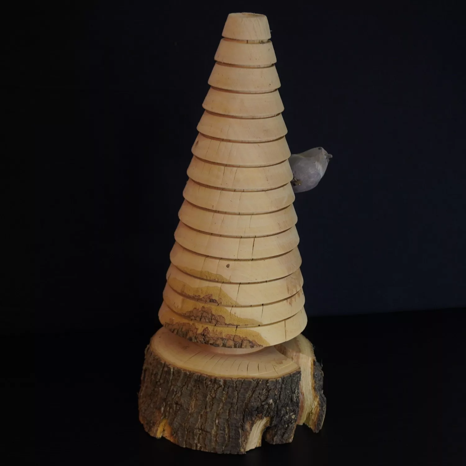 Sapin sculptural tourné dans le bois, aux lignes épurées et naturelles. Sa forme stratifiée évoque le temps et la forêt. Un oiseau artificiel amovible vient s’y poser, ajoutant une touche de poésie et de légèreté.